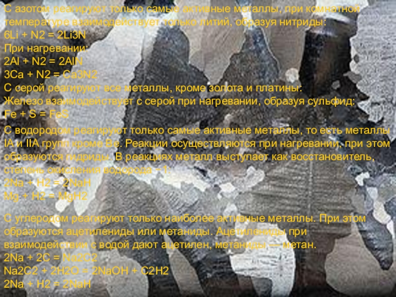 С азотом реагируют только самые активные металлы, при комнатной температуре взаимодействует только литий, образуя нитриды: