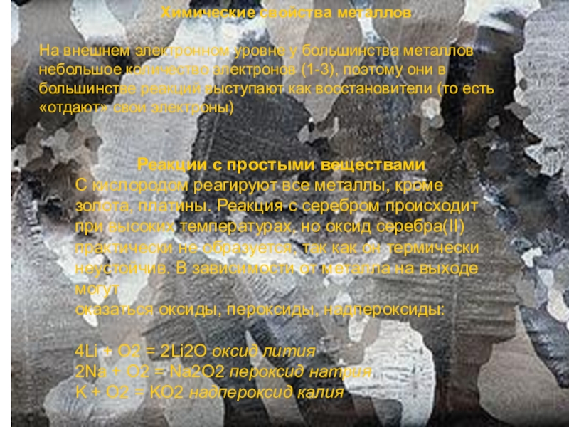 С кислородом реагируют все металлы, кроме золота, платины. Реакция с серебром происходит при высоких температурах, но оксид серебра(II) практически не образуется, так как он термически неустойчив. В зависимости от металла на выходе могут оказаться оксиды, пероксиды, надпероксиды: