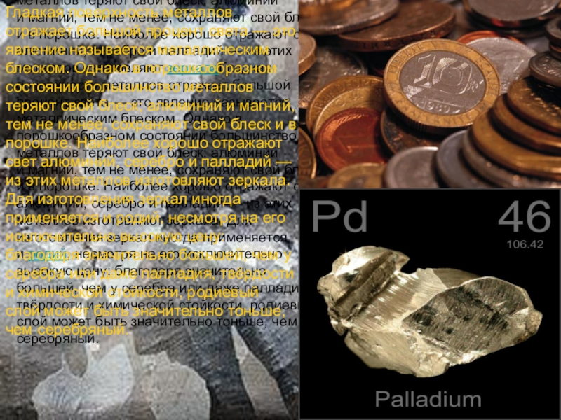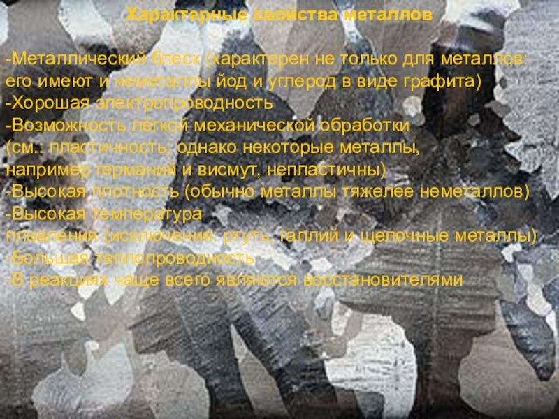 -Металлический блеск (характерен не только для металлов: его имеют и неметаллы йод и углерод в виде графита)