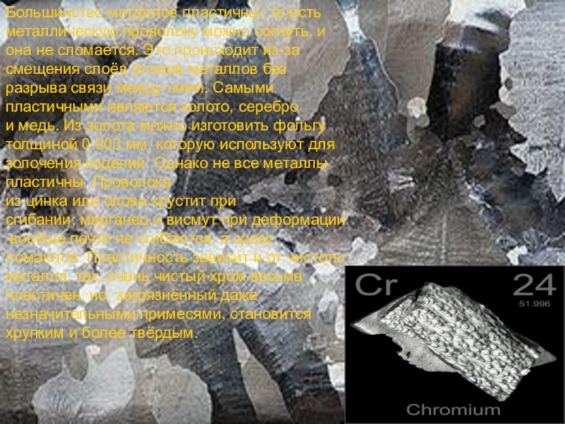 Большинство металлов пластичны, то есть металлическую проволоку можно согнуть, и она не сломается. Это происходит из-за смещения слоёв атомов металлов без разрыва связи между ними. Самыми пластичными являются золото, серебро и медь. Из золота можно изготовить фольгу толщиной 0.003 мм, которую используют для золочения изделий. Однако не все металлы пластичны. Проволока из цинка или олова хрустит при сгибании; марганец и висмут при деформации вообще почти не сгибаются, а сразу ломаются. Пластичность зависит и от чистоты металла; так, очень чистый хром весьма пластичен, но, загрязнённый даже незначительными примесями, становится хрупким и более твёрдым.