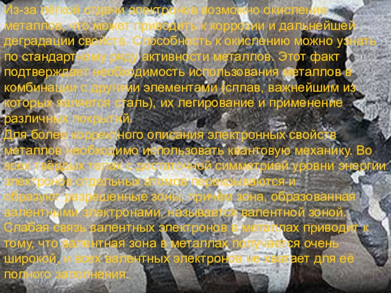 Из-за лёгкой отдачи электронов возможно окисление металлов, что может приводить к коррозии и дальнейшей деградации свойств. Способность к окислению можно узнать по стандартному ряду активности металлов. Этот факт подтверждает необходимость использования металлов в комбинации с другими элементами (сплав, важнейшим из которых является сталь), их легирование и применение различных покрытий.