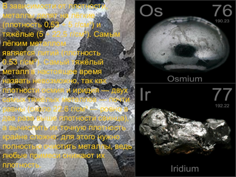 В зависимости от плотности, металлы делят на лёгкие (плотность 0,53 ÷ 5 г/см³) и тяжёлые (5 ÷ 22,5 г/см³). Самым лёгким металлом является литий (плотность 0.53 г/см³). Самый тяжёлый металл в настоящее время назвать невозможно, так как плотности осмия и иридия — двух самых тяжёлых металлов — почти равны (около 22.6 г/см³ — ровно в два раза выше плотности свинца), а вычислить их точную плотность крайне сложно: для этого нужно полностью очистить металлы, ведь любые примеси снижают их плотность.