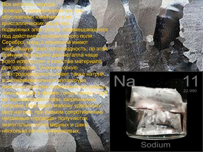 Все металлы хорошо проводят электрический ток; это обусловлено наличием в их кристаллических решётках подвижных электронов, перемещающихся под действием электрического поля. Серебро, медь и алюминий имеют наибольшую электропроводность; по этой причине последние два металла чаще всего используют в качестве материала для проводов. Очень высокую электропроводность имеет также натрий, в экспериментальной аппаратуре известны попытки применения натриевых токопроводов в форме тонкостенных труб из нержавеющей стали, заполненных натрием. Благодаря малому удельному весу натрия, при равном сопротивлении натриевые «провода» получаются значительно легче медных и даже несколько легче алюминиевых.