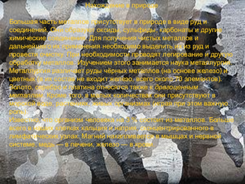 Большая часть металлов присутствует в природе в виде руд и соединений. Они образуют оксиды, сульфиды, карбонаты и другие химические соединения. Для получения чистых металлов и дальнейшего их применения необходимо выделить их из руд и провести очистку. При необходимости проводят легирование и другую обработку металлов. Изучением этого занимается наука металлургия. Металлургия различает руды чёрных металлов (на основе железо) и цветных (в их состав не входит железо, всего около 70 элементов). Золото, серебро и платина относятся также к драгоценным металлам. Кроме того, в малых количествах они присутствуют в морской воде, растениях, живых организмах (играя при этом важную роль).