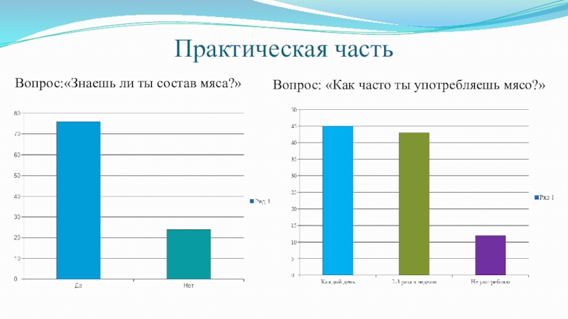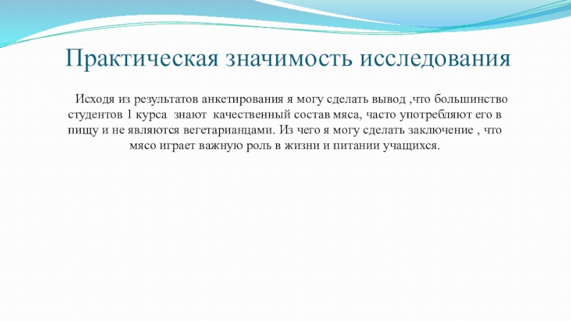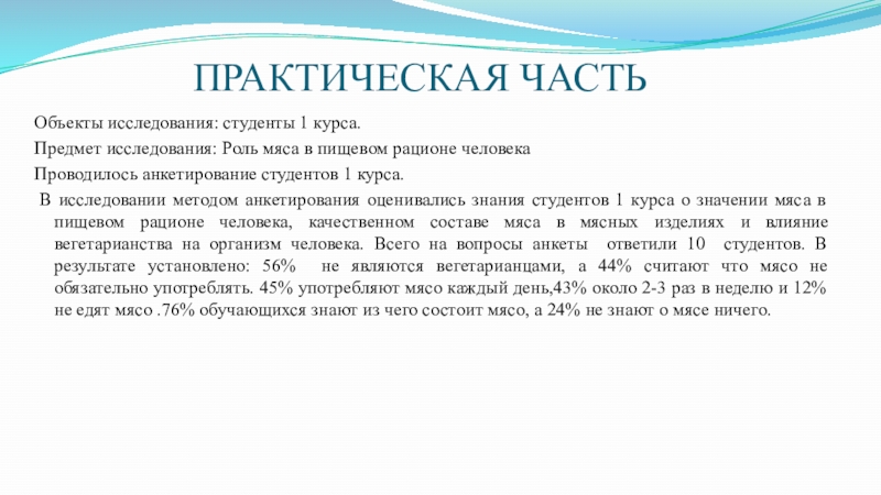 В исследовании методом анкетирования оценивались знания студентов 1 курса о значении мяса в пищевом рационе человека, качественном составе мяса в мясных изделиях и влияние вегетарианства на организм человека. Всего на вопросы анкеты ответили 10 студентов. В результате установлено: 56% не являются вегетарианцами, а 44% считают что мясо не обязательно употреблять. 45% употребляют мясо каждый день,43% около 2-3 раз в неделю и 12% не едят мясо .76% обучающихся знают из чего состоит мясо, а 24% не знают о мясе ничего.