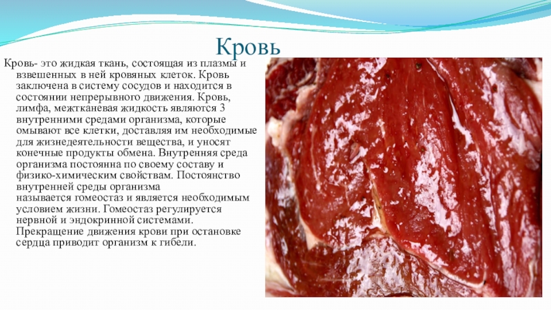 кровяных клеток. Кровь заключена в систему сосудов и находится в состоянии непрерывного движения. Кровь, лимфа, межтканевая жидкость являются 3 внутренними средами организма, которые омывают все клетки, доставляя им необходимые для жизнедеятельности вещества, и уносят конечные продукты обмена. Внутренняя среда организма постоянна по своему составу и физико-химическим свойствам. Постоянство внутренней среды организма называется гомеостаз и является необходимым условием жизни. Гомеостаз регулируется нервной и эндокринной системами. Прекращение движения крови при остановке сердца приводит организм к гибели.