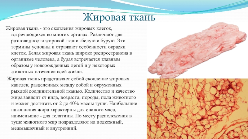 Жировая ткань представляет собой скопление жировых капелек, разделенных между собой и окруженных рыхлой соединительной тканью. Количество и качество жира зависит от вида, возраста, породы, пола животного и может достигать от 2 до 40% массы туши. Наибольшие накопления жира характерны для свиного мяса, наименьшие - для телятины. По месту расположения в туше животного жир подразделяют на подкожный, межмышечный и внутренний.