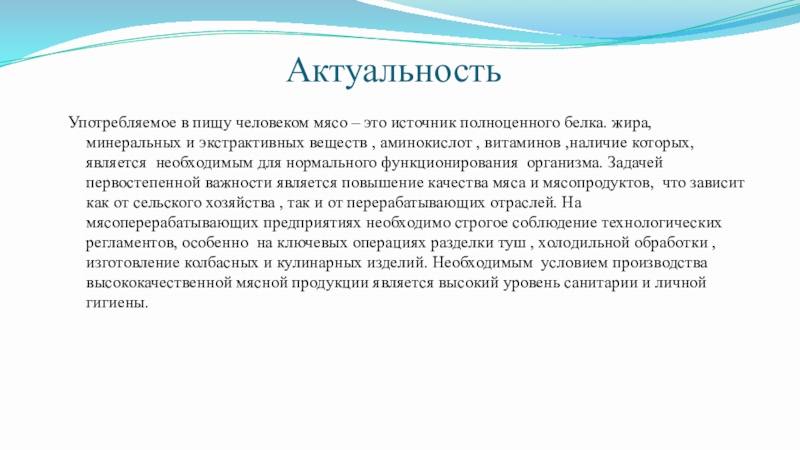 жира, минеральных и экстрактивных веществ , аминокислот , витаминов ,наличие которых, является необходимым для нормального функционирования организма. Задачей первостепенной важности является повышение качества мяса и мясопродуктов, что зависит как от сельского хозяйства , так и от перерабатывающих отраслей. На мясоперерабатывающих предприятиях необходимо строгое соблюдение технологических регламентов, особенно на ключевых операциях разделки туш , холодильной обработки , изготовление колбасных и кулинарных изделий. Необходимым условием производства высококачественной мясной продукции является высокий уровень санитарии и личной гигиены.