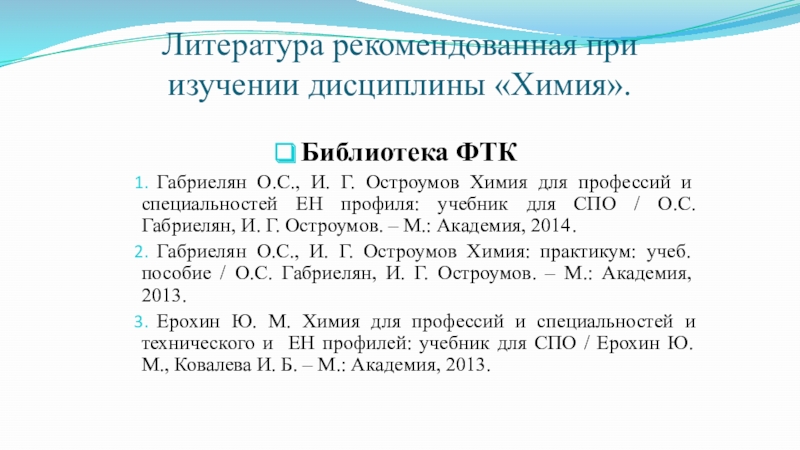 Слайд 19Литература рекомендованная при изучении дисциплины «Химия».