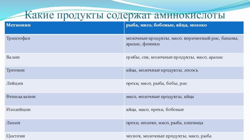 Слайд 11Какие продукты содержат аминокислоты