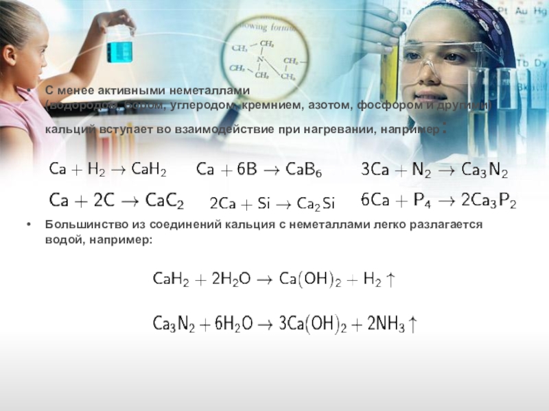 4. Карбид кальция CaC2 широко применяется для получения ацетилена и для восстановления металлов, а также при получении цианамида кальция (нагреванием карбида кальция в азоте при 1200 °C, реакция идет экзотермически, проводится в цианамидных печах).