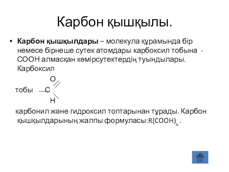 карбонил және гидроксил топтарынан тұрады. Карбон қышқылдарының жалпы формуласы:R(COOH)x..