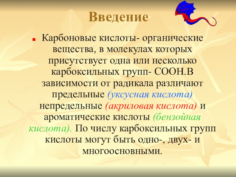 ВведениеКарбоновые кислоты- органические вещества, в молекулах которых присутствует одна или несколько карбоксильных групп- СООН.В зависимости от радикала