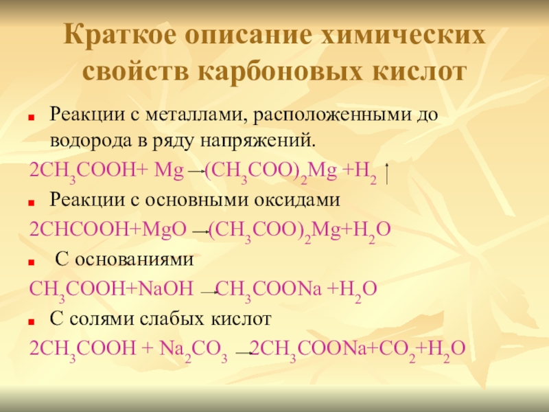 Краткое описание химических свойств карбоновых кислотРеакции с металлами, расположенными до водорода в ряду напряжений.2СН3СООН+ Mg	 (CH3COO)2Mg +H2Реакции