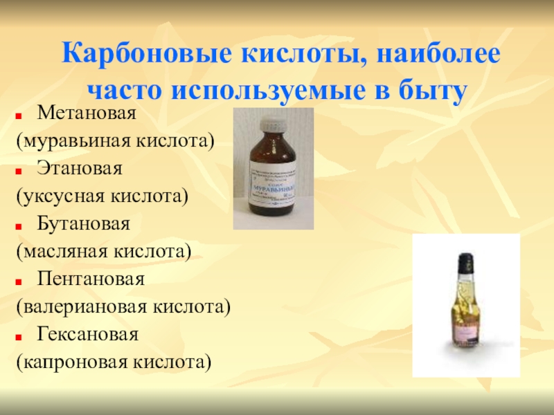 Карбоновые кислоты, наиболее часто используемые в бытуМетановая (муравьиная кислота)Этановая(уксусная кислота)Бутановая(масляная кислота)Пентановая(валериановая кислота)Гексановая(капроновая кислота)