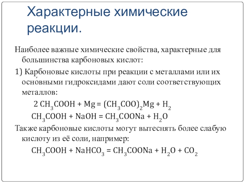 Характерные химические реакции.Наиболее важные химические свойства, характерные для большинства карбоновых кислот:1) Карбоновые кислоты при реакции с металлами