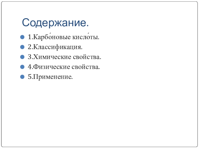 Содержание.1.Карбо́новые кисло́ты.2.Классификация.3.Химические свойства.4.Физические свойства.5.Применение.