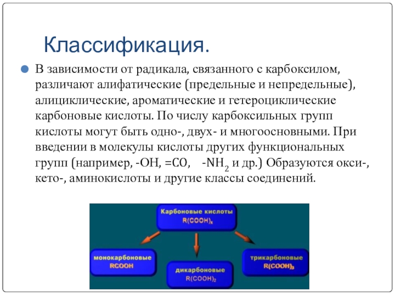 Классификация.  В зависимости от радикала, связанного с карбоксилом, различают алифатические (предельные и непредельные), алициклические, ароматические и