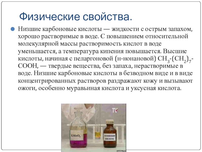 Физические свойства. Низшие карбоновые кислоты — жидкости с ост­рым запахом, хорошо растворимые в воде. С повышением относительной молекулярной