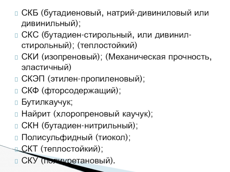Слайд 8СКБ (бутадиеновый, натрий-дивиниловый или дивинильный);