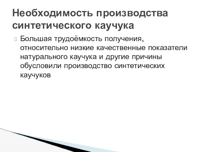 Слайд 6Большая трудоёмкость получения, относительно низкие качественные показатели натурального каучука и другие