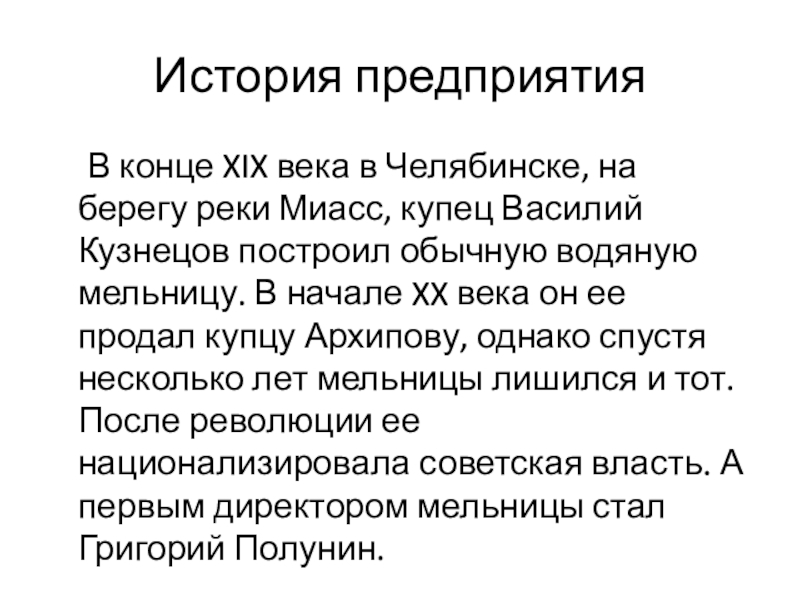 купец Василий Кузнецов построил обычную водяную мельницу. В начале XX века он ее продал купцу Архипову, однако спустя несколько лет мельницы лишился и тот. После революции ее национализировала советская власть. А первым директором мельницы стал Григорий Полунин.