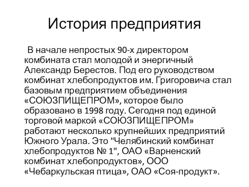 Александр Берестов. Под его руководством комбинат хлебопродуктов им. Григоровича стал базовым предприятием объединения «СОЮЗПИЩЕПРОМ», которое было образовано в 1998 году. Сегодня под единой торговой маркой «СОЮЗПИЩЕПРОМ» работают несколько крупнейших предприятий Южного Урала. Это "Челябинский комбинат хлебопродуктов № 1", ОАО «Варненский комбинат хлебопродуктов», ООО «Чебаркульская птица», ОАО «Соя-продукт».