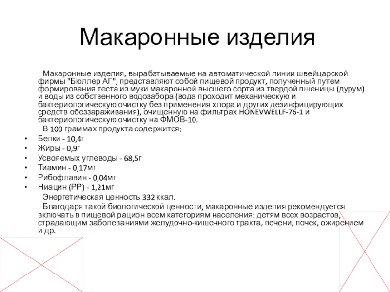 "Бюллер АГ", представляют собой пищевой продукт, полученный путем формирования теста из муки макаронной высшего сорта из твердой пшеницы (дурум) и воды из собственного водозабора (вода проходит механическую и бактериологическую очистку без применения хлора и других дезинфицирующих средств обеззараживания), очищенную на фильтрах HONEVWELLF-76-1 и бактериологическую очистку на ФМОВ-10.