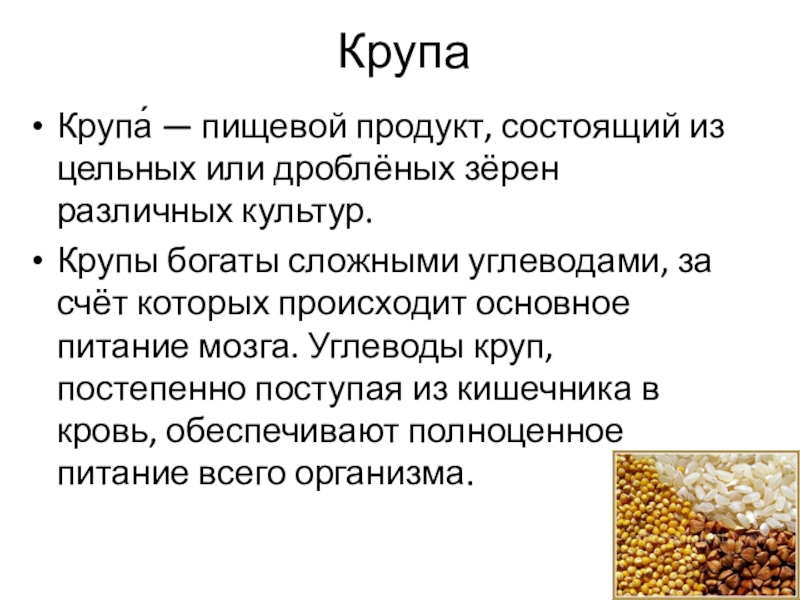 Крупы богаты сложными углеводами, за счёт которых происходит основное питание мозга. Углеводы круп, постепенно поступая из кишечника в кровь, обеспечивают полноценное питание всего организма.
