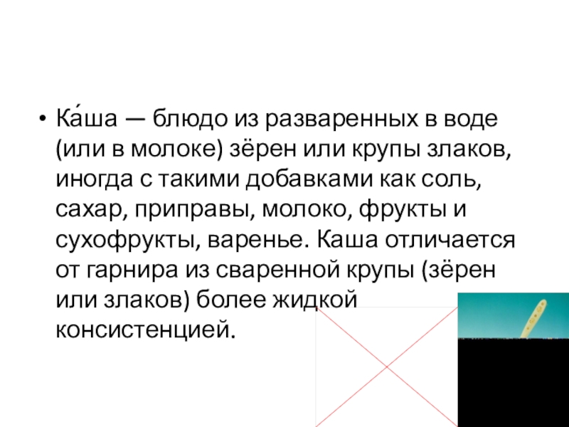 Слайд 13Ка́ша — блюдо из разваренных в воде (или в молоке) зёрен