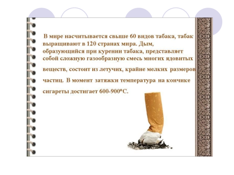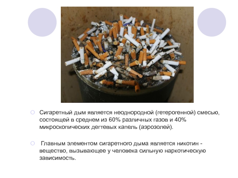 Слайд 11Сигаретный дым является неоднородной (гетерогенной) смесью, состоящей в среднем из 60%