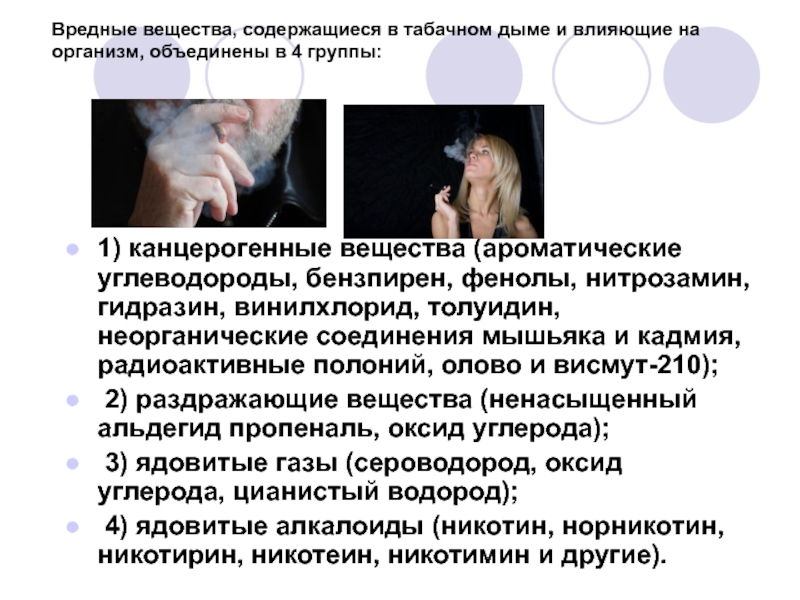 Вредные вещества, содержащиеся в табачном дыме и влияющие на организм, объединены