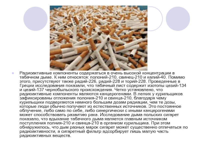 ним относятся: полоний-210, свинец-210 и калий-40. Помимо этого, присутствуют также радий-226, радий-228 и торий-228. Проведенные в Греции исследования показали, что табачный лист содержит изотопы цезий-134 и цезий-137 чернобыльского происхождения. Четко установлено, что радиоактивные компоненты являются канцерогенами. В легких у курильщиков зафиксированы отложения полония-210 и свинца-210, благодаря чему курильщики подвергаются намного большим дозам радиации, чем те дозы, которые люди обычно получают из естественных источников. Это постоянное облучение, либо само по себе, либо синергически с иными канцерогенами может способствовать развитию рака. Исследование дыма польских сигарет показало, что вдыхание табачного дыма является главным источником поступления полния-210 и свинца-210 в организм курильщика. При этом обнаружилось, что дым разных марок сигарет может существенно отличаться по радиоактивности, а сигаретный фильтр адсорбирует лишь малую часть радиоактивных веществ.