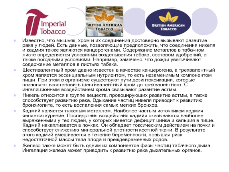 у людей. Есть данные, позволяющие предположить, что соединения никеля и кадмия также являются канцерогенами. Содержание металлов в табачном листе определяется условиями возделывания табака, составом удобрений, а также погодными условиями. Например, замечено, что дожди увеличивают содержание металлов в листьях табака.