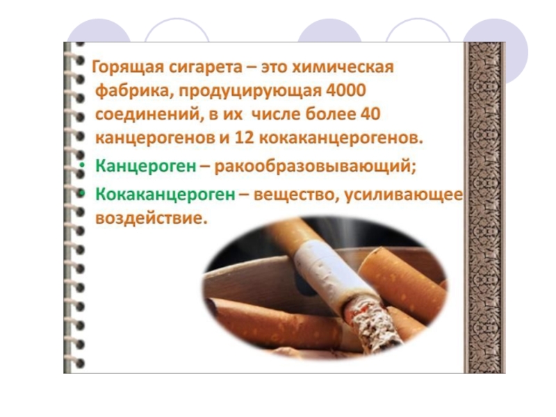 Главным элементом сигаретного дыма является никотин - вещество, вызывающее у человека сильную наркотическую зависимость.