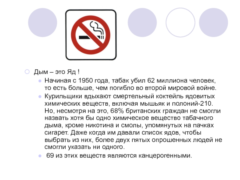 Курильщики вдыхают смертельный коктейль ядовитых химических веществ, включая мышьяк и полоний-210. Но, несмотря на это, 68% британских граждан не смогли назвать хотя бы одно химическое вещество табачного дыма, кроме никотина и смолы, упомянутых на пачках сигарет. Даже когда им давали список ядов, чтобы выбрать из них, более двух пятых опрошенных людей не смогли указать ни одного.