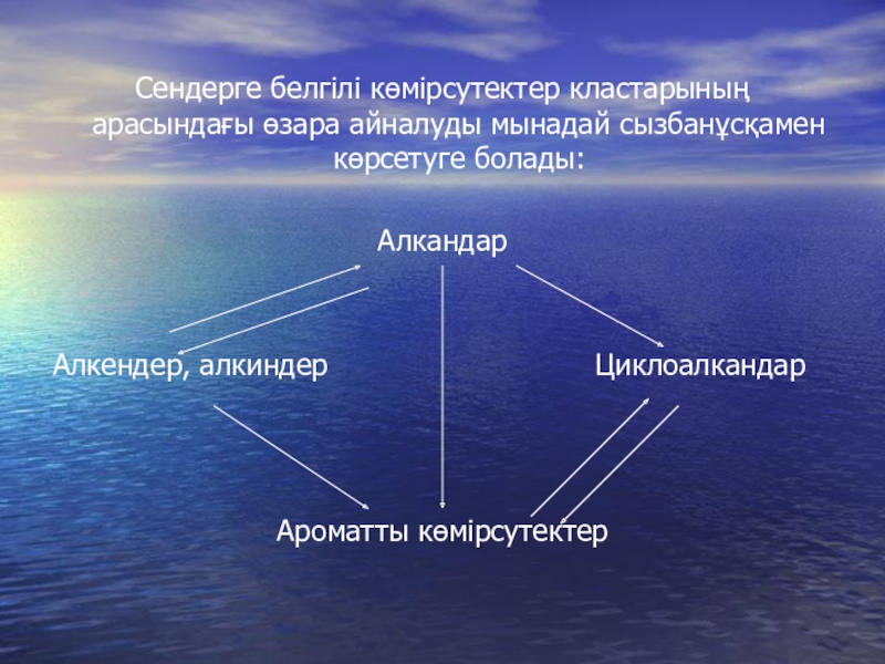 Слайд 3Сендерге белгілі көмірсутектер кластарының арасындағы өзара айналуды мынадай сызбанұсқамен көрсетуге болады: