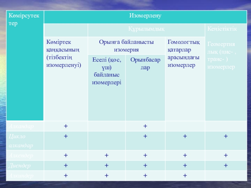 4.Көмірсутектерге байланысты изомерленудің түрлері туралы білімдерінді жүйелеп, төменде келтірілген кестедегі изомерленудің әр түріне мысалдар келтіріп, кестенің сәйкес бағандарындағы орындарға «+» немесе «-» таңбаларын қойыңдар.