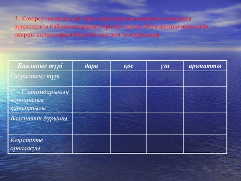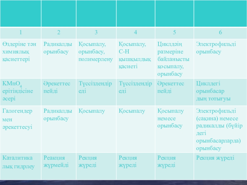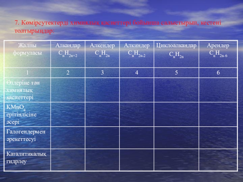 Слайд 137. Көмірсутектерді химиялық қасиеттері бойынша салыстырып, кестені толтырыңдар: