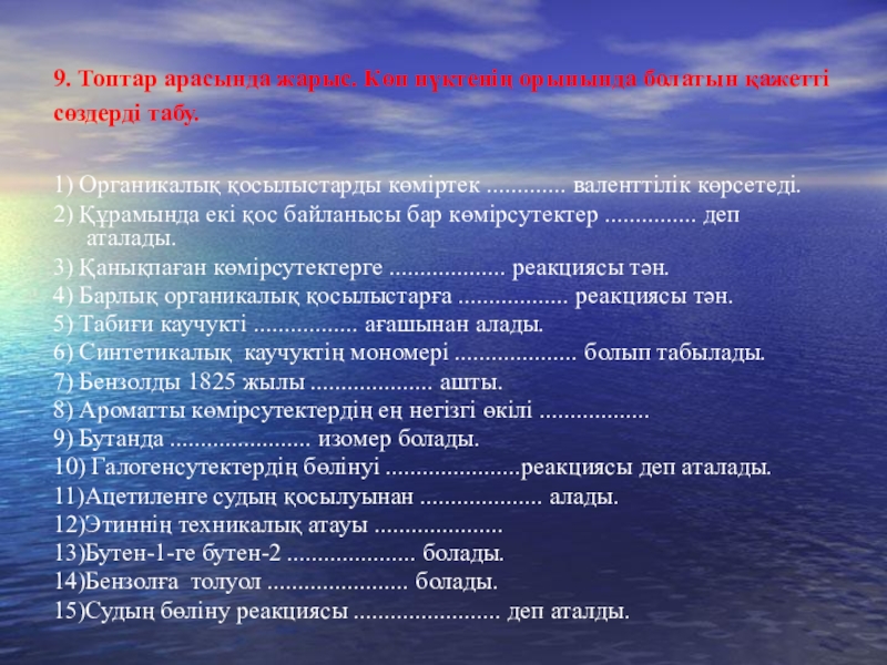 Слайд 169. Топтар арасында жарыс. Көп нүктенің орынында болатын қажетті сөздерді табу.