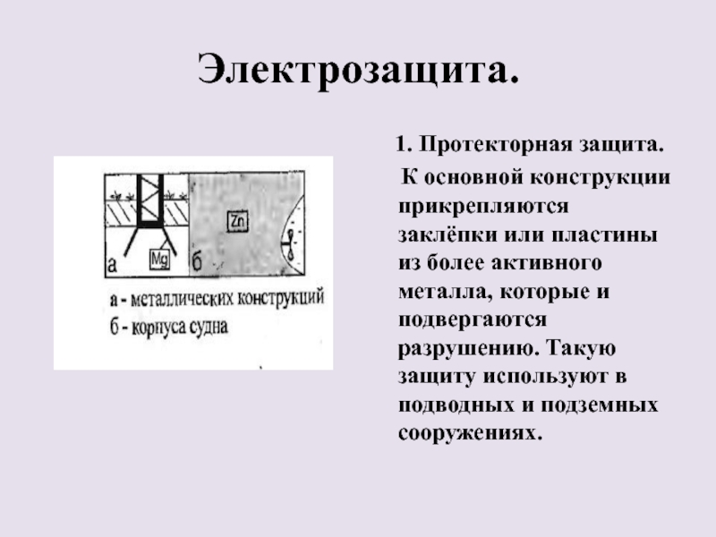 прикрепляются заклёпки или пластины из более активного металла, которые и подвергаются разрушению. Такую защиту используют в подводных и подземных сооружениях.