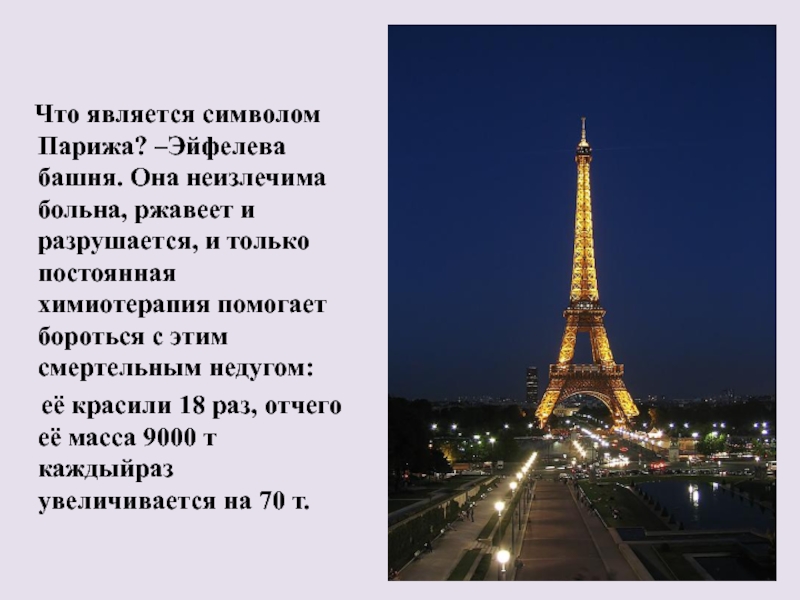 Слайд 6 Что является символом Парижа? –Эйфелева башня. Она неизлечима больна,