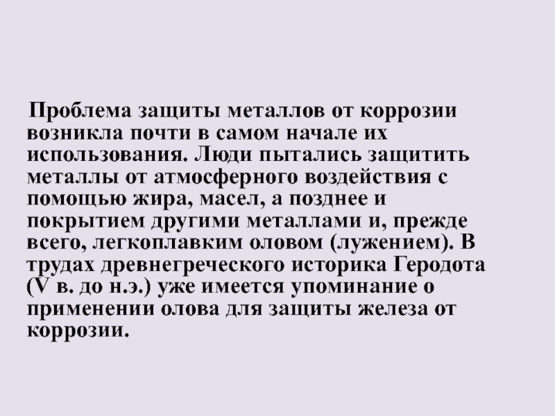 начале их использования. Люди пытались защитить металлы от атмосферного воздействия с помощью жира, масел, а позднее и покрытием другими металлами и, прежде всего, легкоплавким оловом (лужением). В трудах древнегреческого историка Геродота (V в. до н.э.) уже имеется упоминание о применении олова для защиты железа от коррозии.