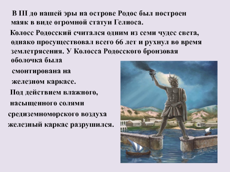 Колосс Родосский считался одним из семи чудес света, однако просуществовал всего 66 лет и рухнул во время землетрясения. У Колосса Родосского бронзовая оболочка была