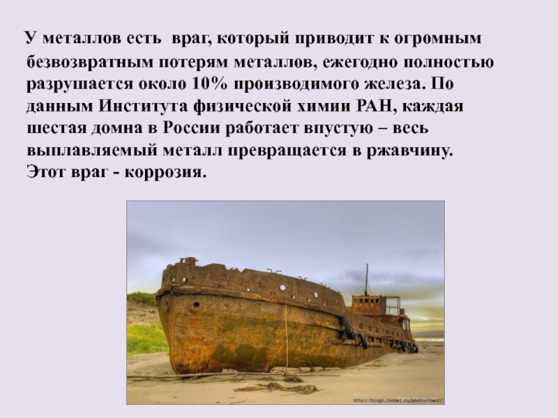 потерям металлов, ежегодно полностью разрушается около 10% производимого железа. По данным Института физической химии РАН, каждая шестая домна в России работает впустую – весь выплавляемый металл превращается в ржавчину. Этот враг - коррозия.