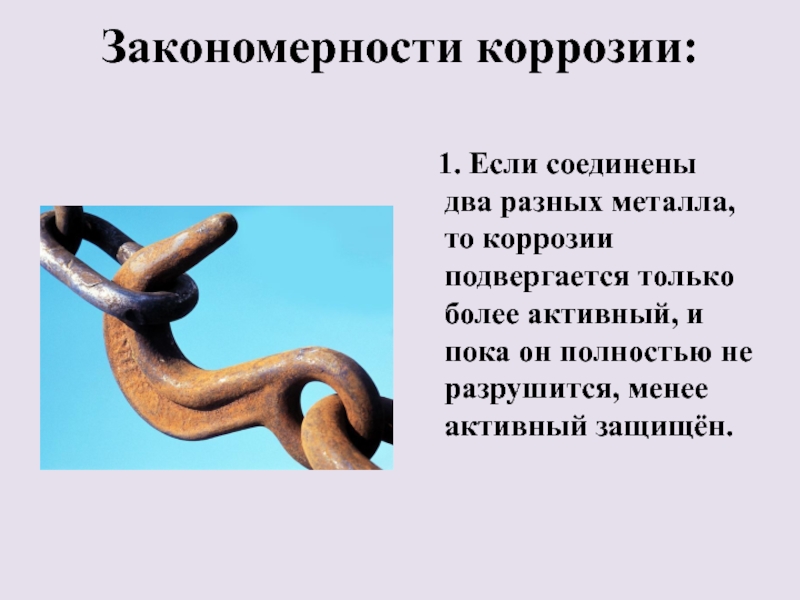 коррозии подвергается только более активный, и пока он полностью не разрушится, менее активный защищён.