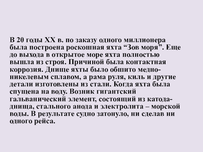 была построена роскошная яхта “Зов моря”. Еще до выхода в открытое море яхта полностью вышла из строя. Причиной была контактная коррозия. Днище яхты было обшито медно-никелевым сплавом, а рама руля, киль и другие детали изготовлены из стали. Когда яхта была спущена на воду. Возник гигантский гальванический элемент, состоящий из катода- днища, стального анода и электролита – морской воды. В результате судно затонуло, ни сделав ни одного рейса.