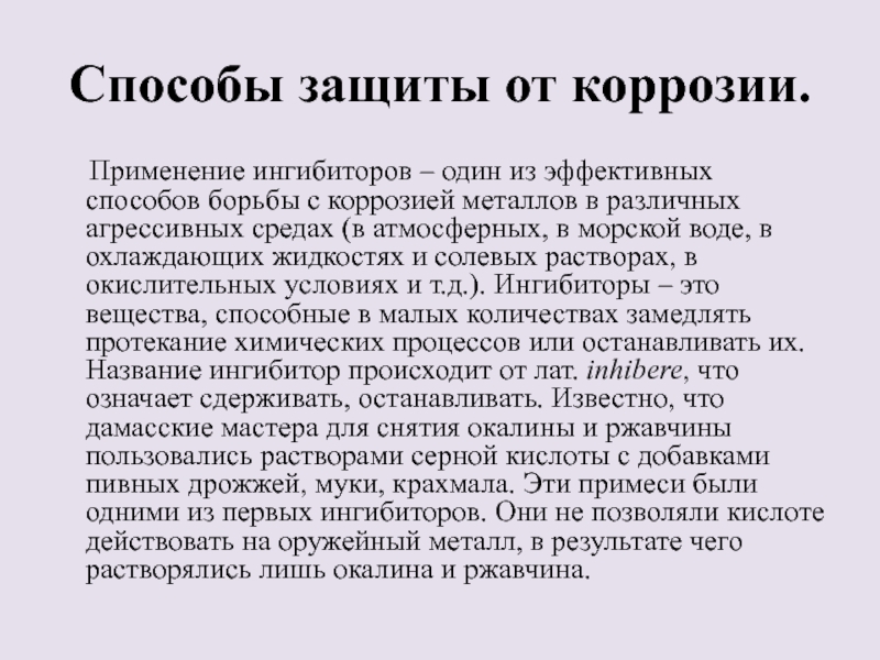эффективных способов борьбы с коррозией металлов в различных агрессивных средах (в атмосферных, в морской воде, в охлаждающих жидкостях и солевых растворах, в окислительных условиях и т.д.). Ингибиторы – это вещества, способные в малых количествах замедлять протекание химических процессов или останавливать их. Название ингибитор происходит от лат. inhibere, что означает сдерживать, останавливать. Известно, что дамасские мастера для снятия окалины и ржавчины пользовались растворами серной кислоты с добавками пивных дрожжей, муки, крахмала. Эти примеси были одними из первых ингибиторов. Они не позволяли кислоте действовать на оружейный металл, в результате чего растворялись лишь окалина и ржавчина.