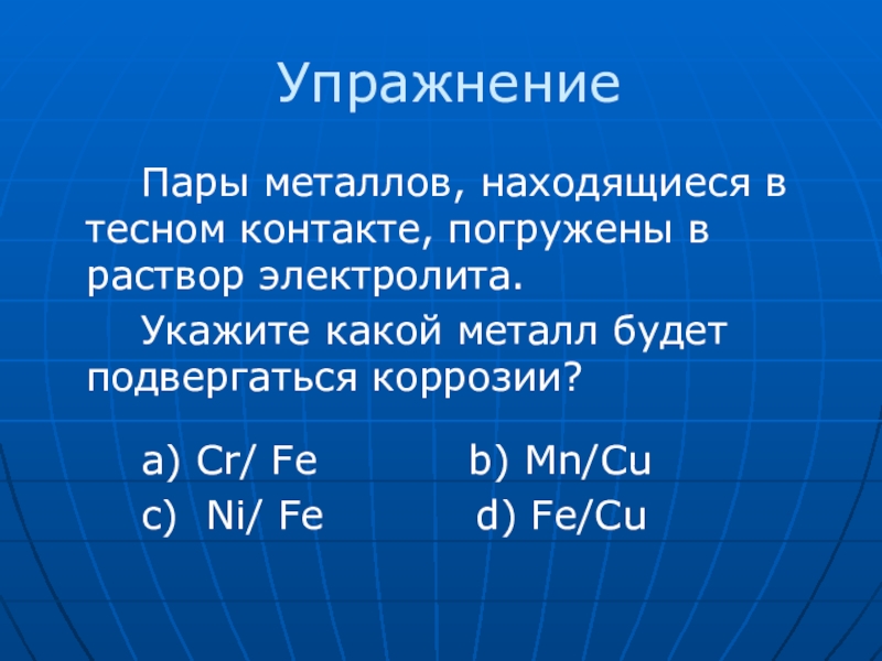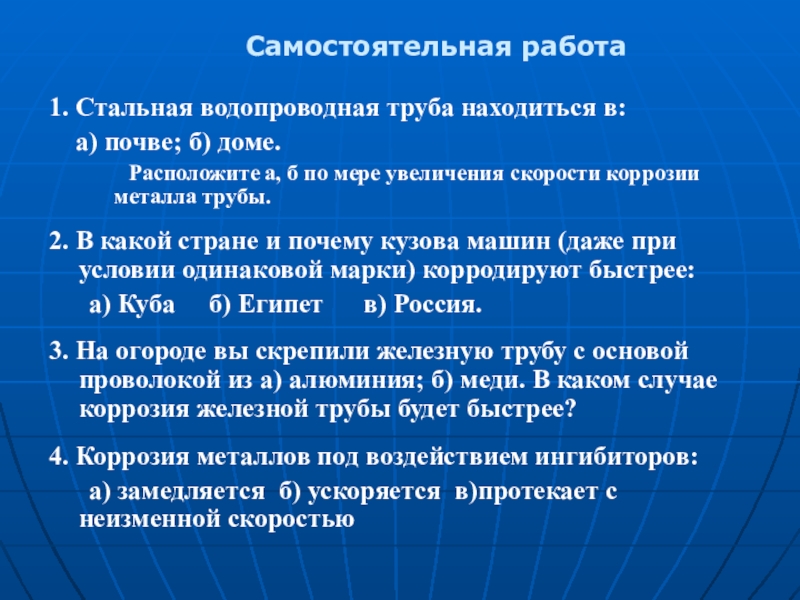 3. На огороде вы скрепили железную трубу с основой проволокой из а) алюминия; б) меди. В каком случае коррозия железной трубы будет быстрее?
