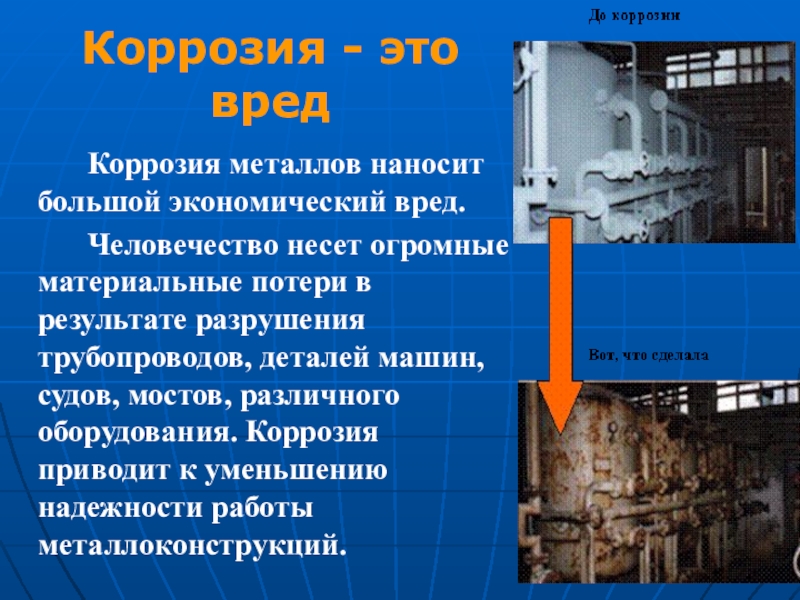 огромные материальные потери в результате разрушения трубопроводов, деталей машин, судов, мостов, различного оборудования. Коррозия приводит к уменьшению надежности работы металлоконструкций.